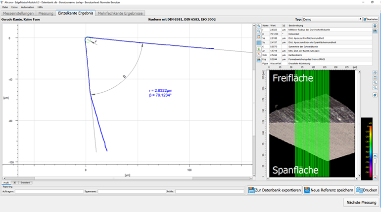Precise measurements are carried out particularly with regard to geometry and chipping of the cutting edge. This reduces the risk of cracks and improves edge stability. Thanks to the LED ring light, edges with varying surface and reflection properties can be measured quickly and intuitively.