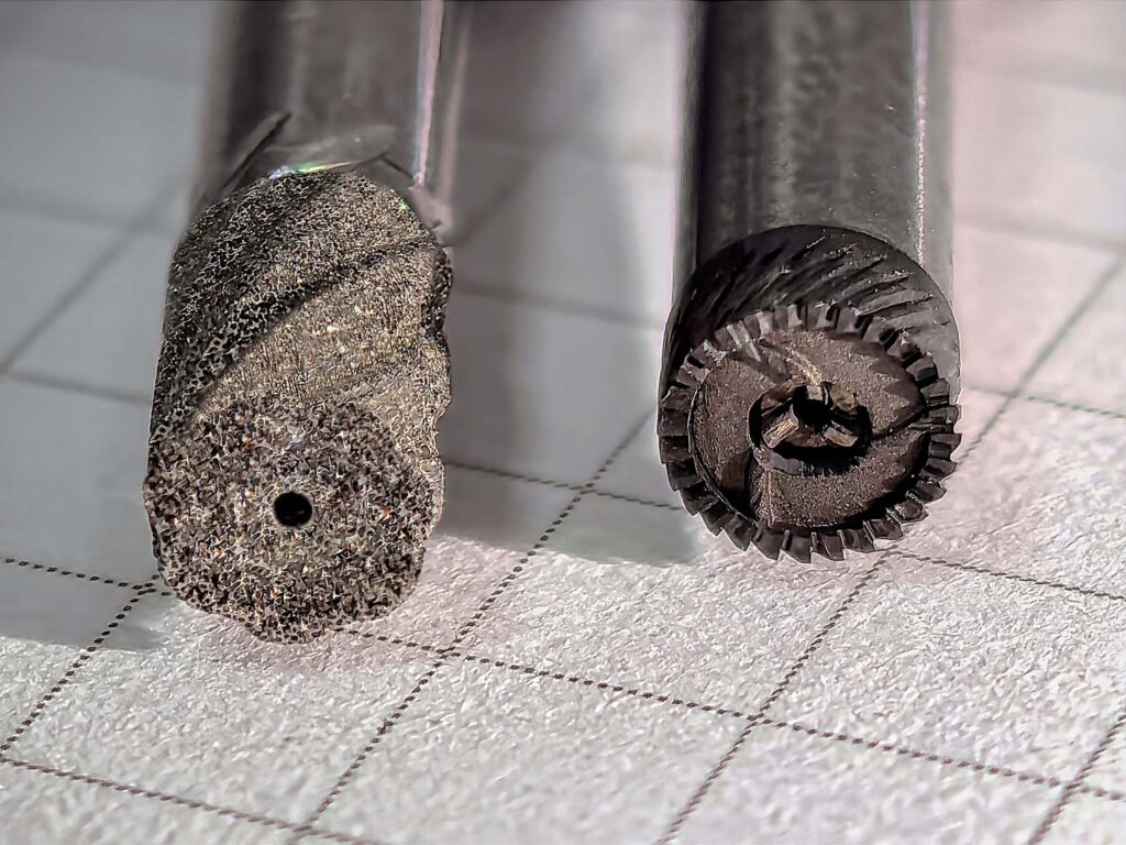 Historically, grinding was the primary method for machining sintered ceramics, especially when precise sizing was needed. In BCE’s applications, for simpler 2D and 2.5D geometries, predefined grinding cycles using mounted points exchanged from the tool magazine are frequently used. Milling cutters and drills are utilised for more intricate 3D geometries and free-form surfaces that are difficult or unfeasible to grind.