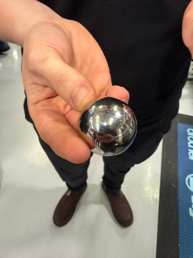 At first glance, the femoral ball component on display appeared to have gone through a traditional polishing process. The surface finish was flawless — smooth, reflective, and consistent across the entire spherical form.