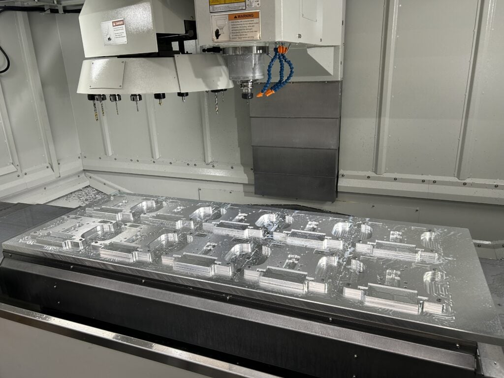 When questioned why these were the machines of choice Shaun states “The 1600 TMC created the possibility to mount more parts on the table at once, therefore reducing the number of times we had to load/unload parts. The 1600mm X travel along with the 650mm in Y backed up our theory. The increase in spindle power over our current machines was also a key point in our decision making. With 11KW (15hp) available and deciding to go with the 12,000-rpm option with through spindle coolant our cutting performance has greatly increased. We are now profiling the aluminium parts at 6 to 7m/min feedrate greatly reducing cycle time. With 20 BT40 tools in the carousel available we can leave more tools set up and reduce the number of times we have to exchange the tools in the machine. With the TMC 1600 installed we have seen production of the base plates go from one every half hour to ten in two hours”.