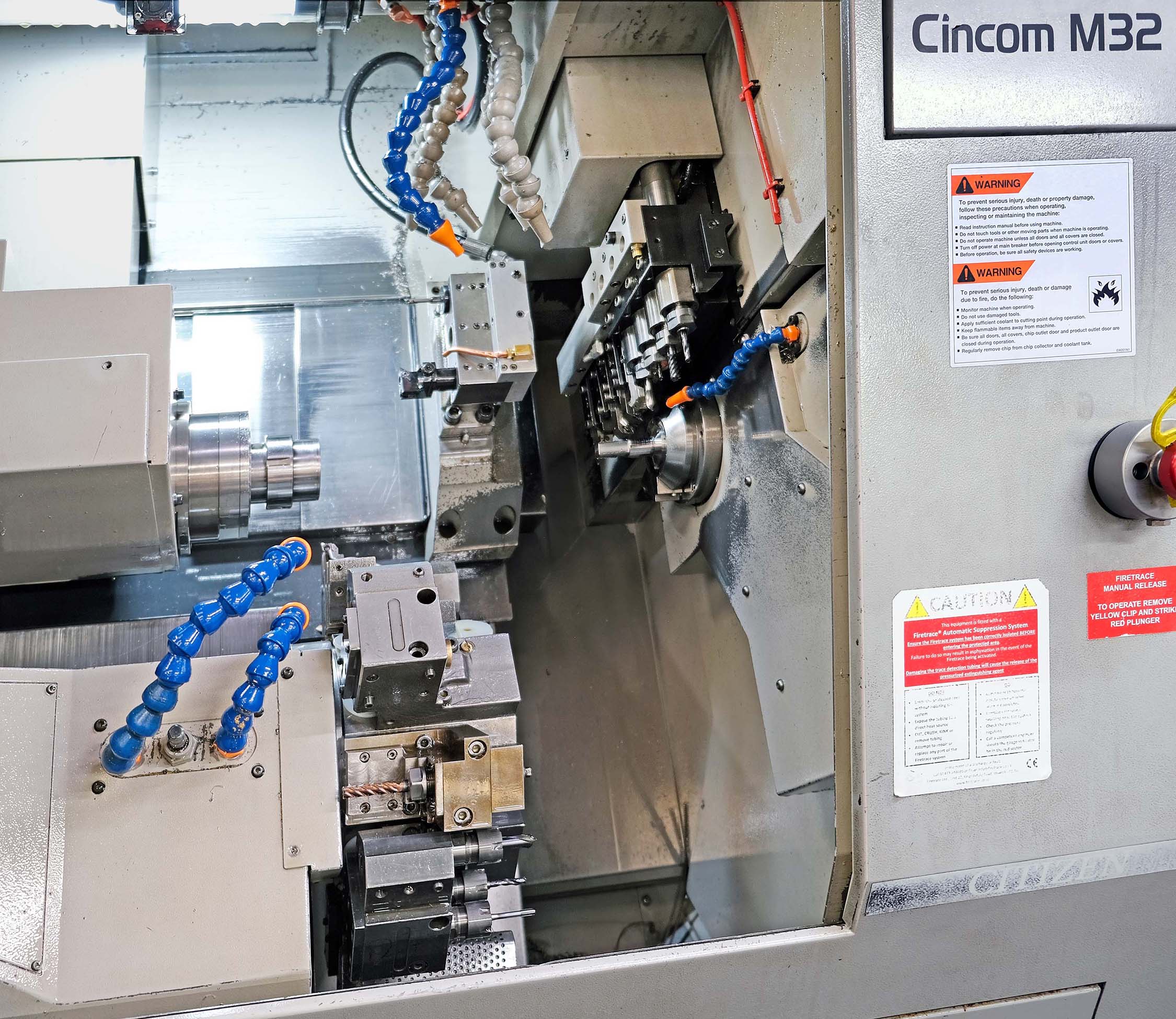 With the aim of transferring sub-12 mm diameter parts production from the 32 mm capacity sliding-head turning machines to more appropriately sized, nimble lathes, two B12 Cincoms arrived in August 2022. Among numerous other jobs, they are used around the clock every week for turning 10,000 mild steel pins that go into control boxes for heating and ventilating systems.