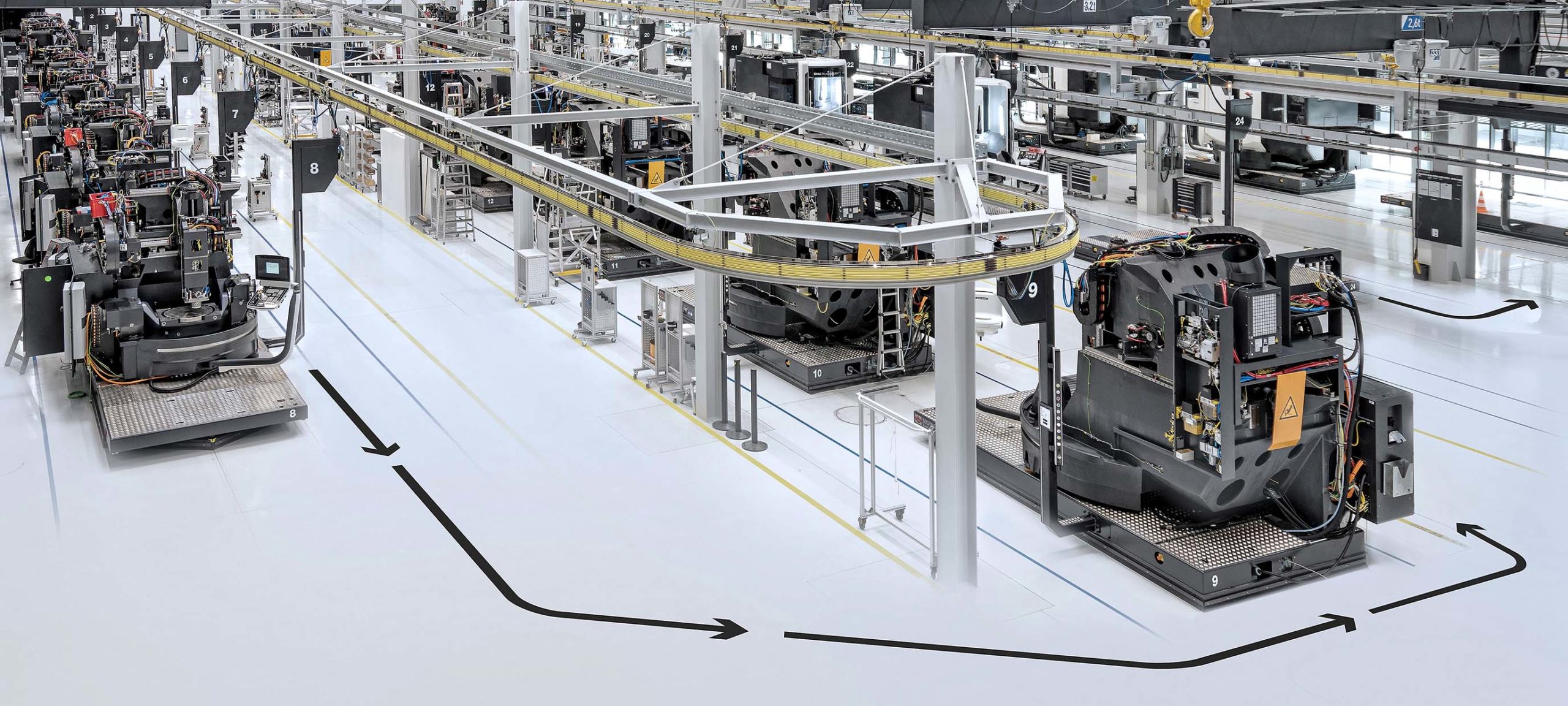 The heart of production in the new factory is an AGV transport system. By optical navigation using the latest laser scanning technology, it moves the machines continuously and autonomously through the assembly stations at a speed of 45 mm/minute. As of now, the complete model mix of the monoBLOCK series including all models with a pallet changer (DMC) and with a turn-mill table (FD) is built in a flow line in 34 cycles, starting with basic assembly and finishing with final inspection.