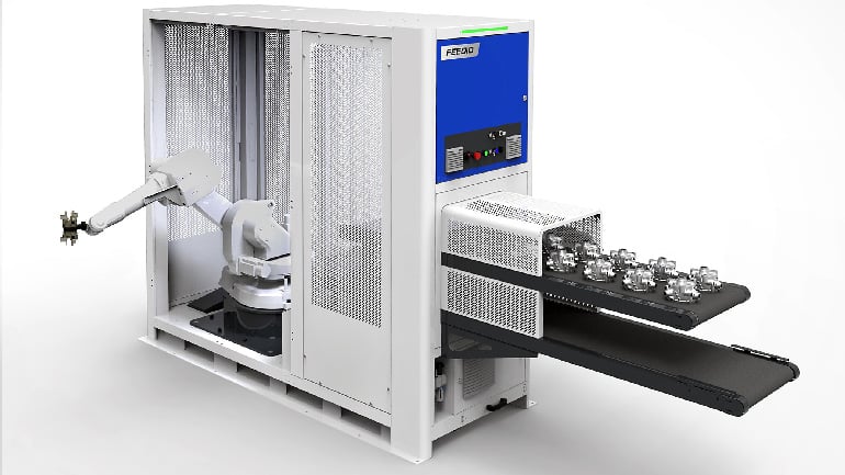 A robotic component handling system, Feedio, has been introduced by the Japanese manufacturer, Brother, to increase the production efficiency of its Speedio range of 3- to 5-axis machining centres. Available in the UK and Ireland through Whitehouse Machine Tools, the compact unit can be retrofitted to upgrade any machine in the range.