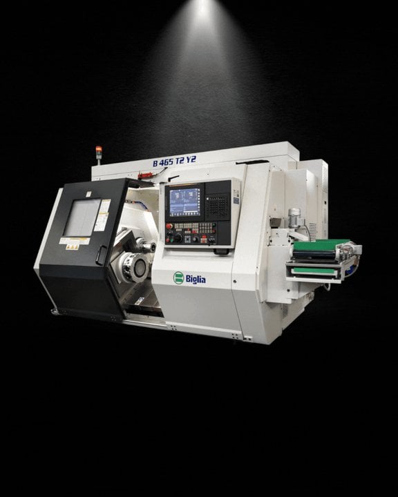 The Biglia Spa B465 T2Y2 is engineered for advanced manufacturing needs. It features twin spindles, twin turrets, twin Y axes, and an 80mm bar capacity, providing several multi-axis bar turning capabilities. These features are designed to perform advanced, simultaneous operations, significantly reducing cycle times and enhancing productivity for industrial users.