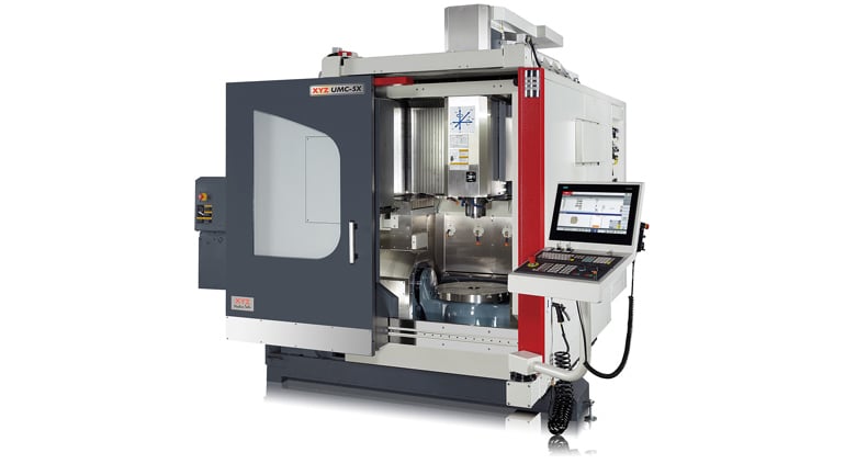 With the arrival of the UMC-5X a gantry-style simultaneous five-axis machining centre, XYZ Machine Tools moved the goalposts when it came to price/performance ratios on this type of machine. The specification and capability of the UMC-5X sets it apart from similar priced machines, and puts it ahead of many costing significantly more. Available with either the Siemens 840DSL Shopmill or Heidenhain iTNC 640 HSCI control systems, with their market leading machine control software such as Traori and Kinematic functions during five-axis simultaneous machining for improved accuracy. The UMC-5X also sets itself apart with its machining capacity, with a table configuration and machine design that allows a full 500 mm of Y-axis travel forward of the table when it is rotated 90 degrees towards the rear (component facing forward), allowing larger workpieces to be machined in comparison to many competitor machines, including those that quote the same, or bigger, axis travels than the UMC-5X.