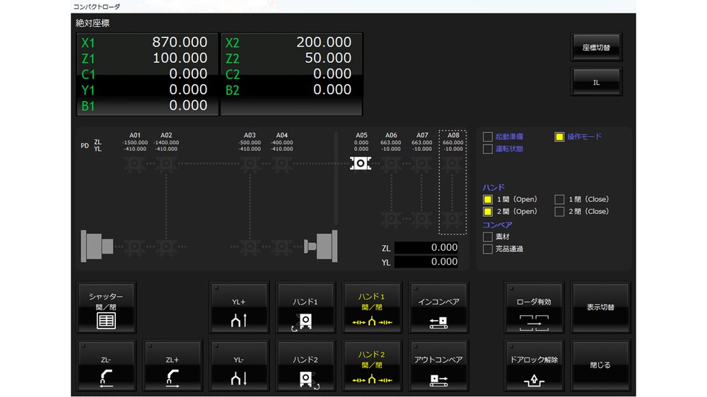 The Compact Loader servo, featuring a servo-driven vertical-axis hand, is now available! The servo type offers improved travel speed and positioning accuracy compared to the conventional type. In addition, it allows users to specify teaching points, making setups even more convenient. The Compact Loader servo can be controlled from its dedicated screen. *The Compact Loader servo is available for the MX-100 only.